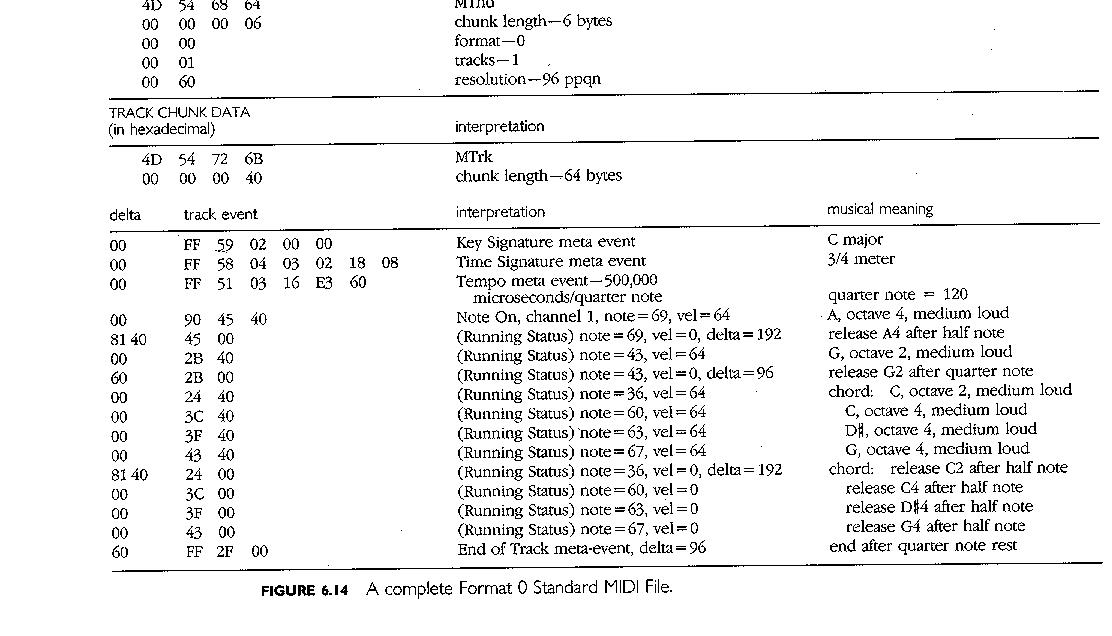 Here is the matlab code for generating a midi file given the midi binary content in hexadecimal. The file content is similar to the one in Figure 2.12 above, Only longer.